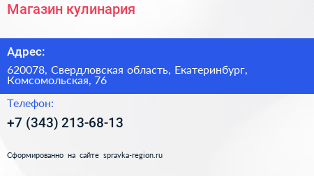 Магазин-кулинария по адресу 620078, Свердловская область, Екатеринбург, Комсомольская, 76 в дальнейшем Организация, размещена в следующих категориях: