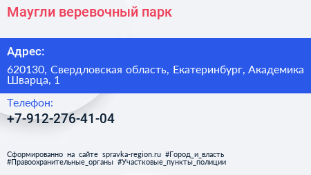 Маугли, веревочный парк по адресу 620130, Свердловская область, Екатеринбург, Академика Шварца, 1 в дальнейшем Организация, размещена в следующих категориях: