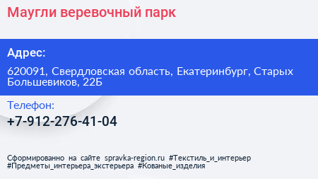 Маугли, веревочный парк по адресу 620091, Свердловская область, Екатеринбург, Старых Большевиков, 22Б в дальнейшем Организация, размещена в следующих категориях: