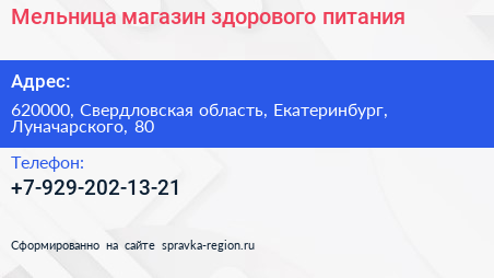 Мельница, магазин здорового питания по адресу 620000, Свердловская область, Екатеринбург, Луначарского, 80 в дальнейшем Организация, размещена в следующих категориях: