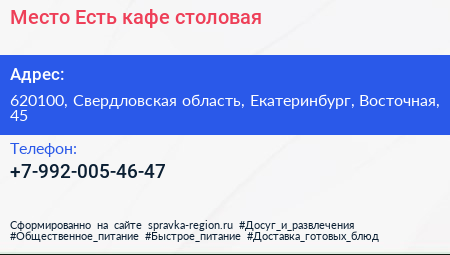 Место Есть, кафе-столовая по адресу 620100, Свердловская область, Екатеринбург, Восточная, 45 в дальнейшем Организация, размещена в следующих категориях: