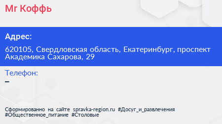 Mr.Коффь по адресу 620105, Свердловская область, Екатеринбург, проспект Академика Сахарова, 29 в дальнейшем Организация, размещена в следующих категориях: