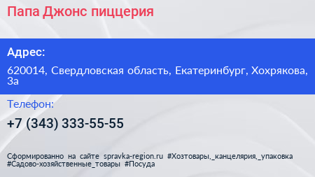 Папа Джонс, пиццерия по адресу 620014, Свердловская область, Екатеринбург, Хохрякова, 3а в дальнейшем Организация, размещена в следующих категориях: