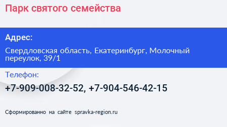 Парк святого семейства по адресу Свердловская область, Екатеринбург, Молочный переулок, 39/1 в дальнейшем Организация, размещена в следующих категориях: