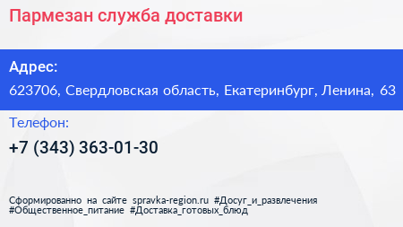 Пармезан, служба доставки по адресу 623706, Свердловская область, Екатеринбург, Ленина, 63 в дальнейшем Организация, размещена в следующих категориях: