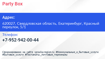 Party Box по адресу 620027, Свердловская область, Екатеринбург, Красный переулок, 5/1 в дальнейшем Организация, размещена в следующих категориях:
