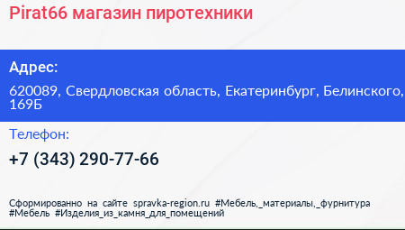 Pirat66, магазин пиротехники по адресу 620089, Свердловская область, Екатеринбург, Белинского, 169Б в дальнейшем Организация, размещена в следующих категориях: