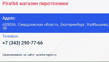 Pirat66, магазин пиротехники по адресу 620026, Свердловская область, Екатеринбург, Куйбышева, 38 в дальнейшем Организация, размещена в следующих категориях: