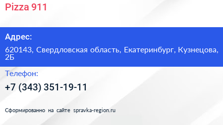 Pizza 911 по адресу 620143, Свердловская область, Екатеринбург, Кузнецова, 2Б в дальнейшем Организация, размещена в следующих категориях: