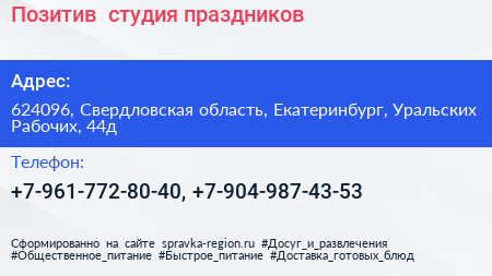 Позитив+, студия праздников по адресу 624096, Свердловская область, Екатеринбург, Уральских Рабочих, 44д в дальнейшем Организация, размещена в следующих категориях: