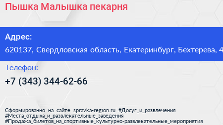 Пышка Малышка, пекарня по адресу 620137, Свердловская область, Екатеринбург, Бехтерева, 4 в дальнейшем Организация, размещена в следующих категориях: