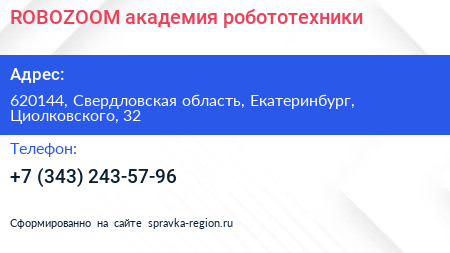 ROBOZOOM, академия робототехники по адресу 620144, Свердловская область, Екатеринбург, Циолковского, 32 в дальнейшем Организация, размещена в следующих категориях: