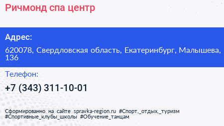 Ричмонд, спа-центр по адресу 620078, Свердловская область, Екатеринбург, Малышева, 136 в дальнейшем Организация, размещена в следующих категориях: