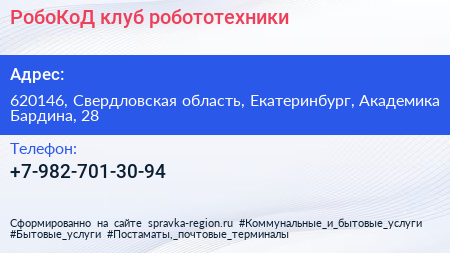 РобоКоД, клуб робототехники по адресу 620146, Свердловская область, Екатеринбург, Академика Бардина, 28 в дальнейшем Организация, размещена в следующих категориях: