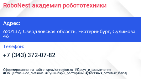 RoboNest, академия робототехники по адресу 620137, Свердловская область, Екатеринбург, Сулимова, 46 в дальнейшем Организация, размещена в следующих категориях: