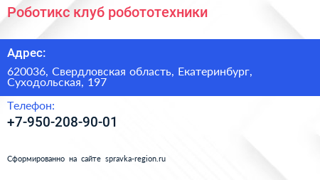 Роботикс, клуб робототехники по адресу 620036, Свердловская область, Екатеринбург, Суходольская, 197 в дальнейшем Организация, размещена в следующих категориях: