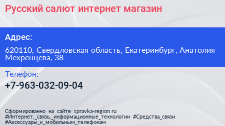 Русский салют, интернет-магазин по адресу 620110, Свердловская область, Екатеринбург, Анатолия Мехренцева, 38 в дальнейшем Организация, размещена в следующих категориях: