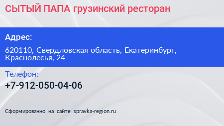 СЫТЫЙ ПАПА, грузинский ресторан по адресу 620110, Свердловская область, Екатеринбург, Краснолесья, 24 в дальнейшем Организация, размещена в следующих категориях: