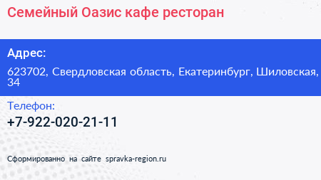 Семейный Оазис, кафе-ресторан по адресу 623702, Свердловская область, Екатеринбург, Шиловская, 34 в дальнейшем Организация, размещена в следующих категориях: