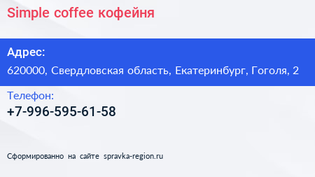 Simple coffee, кофейня по адресу 620000, Свердловская область, Екатеринбург, Гоголя, 2 в дальнейшем Организация, размещена в следующих категориях: