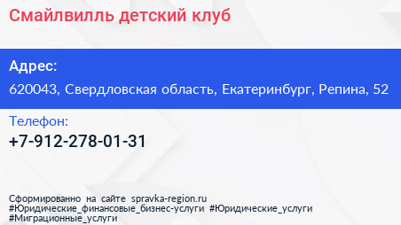 Смайлвилль, детский клуб по адресу 620043, Свердловская область, Екатеринбург, Репина, 52 в дальнейшем Организация, размещена в следующих категориях: