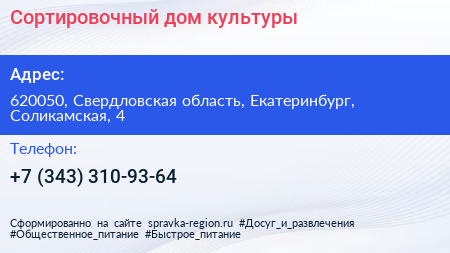 Сортировочный, дом культуры по адресу 620050, Свердловская область, Екатеринбург, Соликамская, 4 в дальнейшем Организация, размещена в следующих категориях: