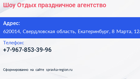 Шоу & Отдых, праздничное агентство по адресу 620014, Свердловская область, Екатеринбург, 8 Марта, 12а в дальнейшем Организация, размещена в следующих категориях: