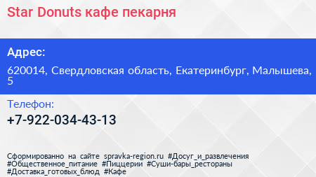 Star Donuts, кафе-пекарня по адресу 620014, Свердловская область, Екатеринбург, Малышева, 5 в дальнейшем Организация, размещена в следующих категориях: