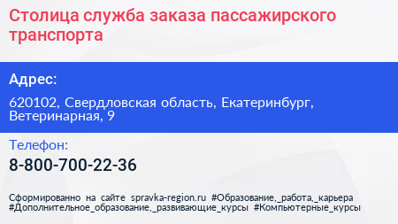 Столица, служба заказа пассажирского транспорта по адресу 620102, Свердловская область, Екатеринбург, Ветеринарная, 9 в дальнейшем Организация, размещена в следующих категориях: