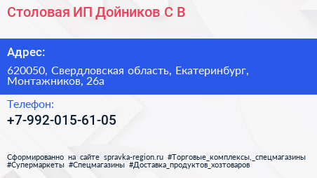 Столовая, ИП Дойников С.В. по адресу 620050, Свердловская область, Екатеринбург, Монтажников, 26а в дальнейшем Организация, размещена в следующих категориях: