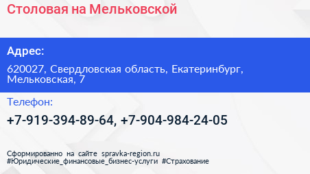 Столовая на Мельковской по адресу 620027, Свердловская область, Екатеринбург, Мельковская, 7 в дальнейшем Организация, размещена в следующих категориях: