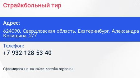Страйкбольный тир по адресу 624090, Свердловская область, Екатеринбург, Александра Козицына, 2/7 в дальнейшем Организация, размещена в следующих категориях: