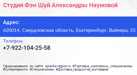 Студия Фэн-Шуй Александры Наумовой по адресу 620014, Свердловская область, Екатеринбург, Вайнера, 55 в дальнейшем Организация, размещена в следующих категориях: