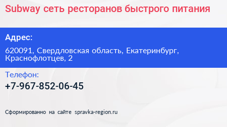 Subway, сеть ресторанов быстрого питания по адресу 620091, Свердловская область, Екатеринбург, Краснофлотцев, 2 в дальнейшем Организация, размещена в следующих категориях: