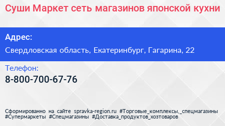 Суши-Маркет, сеть магазинов японской кухни по адресу Свердловская область, Екатеринбург, Гагарина, 22 в дальнейшем Организация, размещена в следующих категориях: