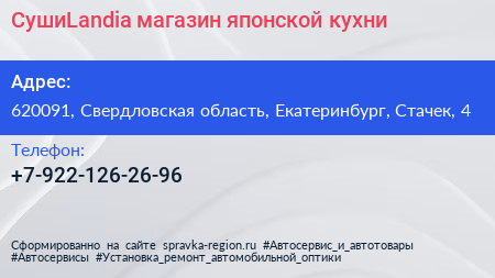СушиLandia, магазин японской кухни по адресу 620091, Свердловская область, Екатеринбург, Стачек, 4 в дальнейшем Организация, размещена в следующих категориях: