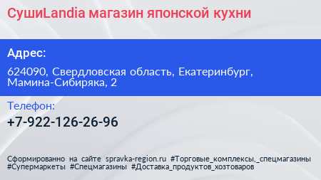 СушиLandia, магазин японской кухни по адресу 624090, Свердловская область, Екатеринбург, Мамина-Сибиряка, 2 в дальнейшем Организация, размещена в следующих категориях: