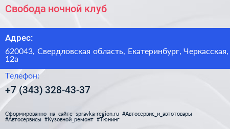Свобода, ночной клуб по адресу 620043, Свердловская область, Екатеринбург, Черкасская, 12а в дальнейшем Организация, размещена в следующих категориях:
