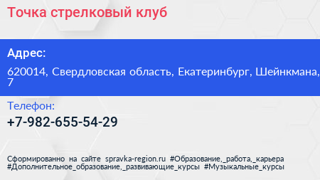 Точка, стрелковый клуб по адресу 620014, Свердловская область, Екатеринбург, Шейнкмана, 7 в дальнейшем Организация, размещена в следующих категориях: