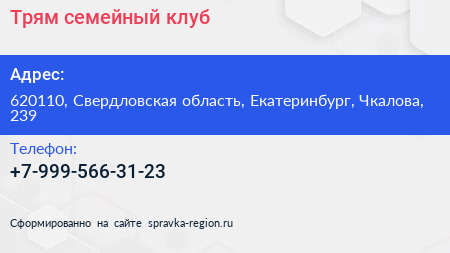 Трям, семейный клуб по адресу 620110, Свердловская область, Екатеринбург, Чкалова, 239 в дальнейшем Организация, размещена в следующих категориях: