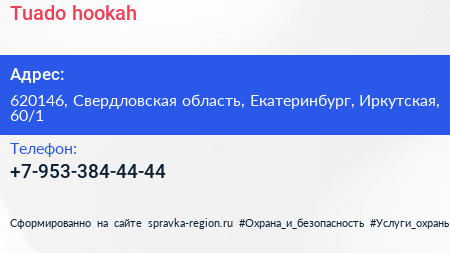 Tuado hookah по адресу 620146, Свердловская область, Екатеринбург, Иркутская, 60/1 в дальнейшем Организация, размещена в следующих категориях: