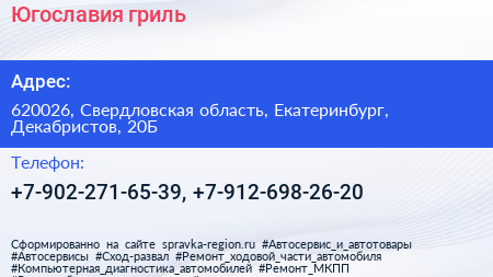 Югославия гриль по адресу 620026, Свердловская область, Екатеринбург, Декабристов, 20Б в дальнейшем Организация, размещена в следующих категориях: