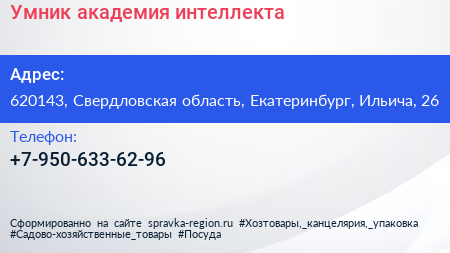 Умник, академия интеллекта по адресу 620143, Свердловская область, Екатеринбург, Ильича, 26 в дальнейшем Организация, размещена в следующих категориях: