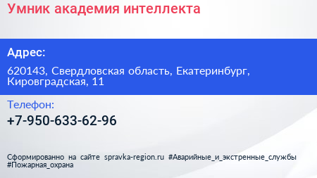 Умник, академия интеллекта по адресу 620143, Свердловская область, Екатеринбург, Кировградская, 11 в дальнейшем Организация, размещена в следующих категориях: