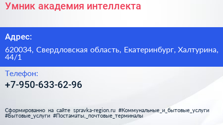 Умник, академия интеллекта по адресу 620034, Свердловская область, Екатеринбург, Халтурина, 44/1 в дальнейшем Организация, размещена в следующих категориях:
