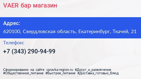 VAER, бар-магазин по адресу 620100, Свердловская область, Екатеринбург, Ткачей, 21 в дальнейшем Организация, размещена в следующих категориях:
