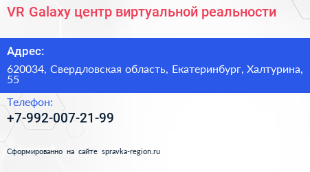 VR Galaxy, центр виртуальной реальности по адресу 620034, Свердловская область, Екатеринбург, Халтурина, 55 в дальнейшем Организация, размещена в следующих категориях: