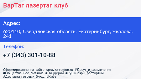 ВарТаг, лазертаг-клуб по адресу 620110, Свердловская область, Екатеринбург, Чкалова, 241 в дальнейшем Организация, размещена в следующих категориях: