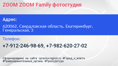 ZOOM ZOOM Family, фотостудия по адресу 620062, Свердловская область, Екатеринбург, Генеральская, 3 в дальнейшем Организация, размещена в следующих категориях: