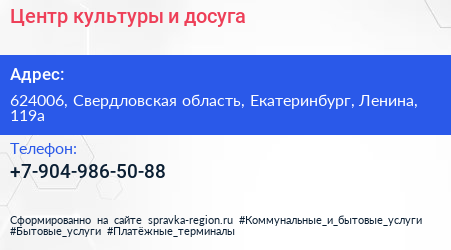 Центр культуры и досуга по адресу 624006, Свердловская область, Екатеринбург, Ленина, 119а в дальнейшем Организация, размещена в следующих категориях: